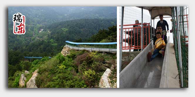 滑道是一種無載人工具滑道,靠重力自然下滑,速度由游客自己控制,安全好玩!是自然景區中一種新型的娛樂與代步為一體的參與性娛樂設施!它是以拋光的花崗巖石為主要材料,依山體坡度修建而成的巨型凹槽。既是老少皆宜的娛樂設施,又是充滿童趣的代步工具。
